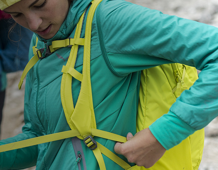 Stelle dich gerade hin und ziehe an den Schulterriemen. Sie sollten fest auf der Schulter sitzen, ohne diese im Bewegungsablauf zu behindern. Moderne Rucksäcke haben ergonomisch geformte Schulterriemen. Viele Modelle von Salewa haben darüber hinaus zweigeteilte Riemen (Split Shoulder Straps), die sich noch besser an den Oberkörper und die Schultern anpassen und damit eine gute Lastenkontrolle bei genügend Bewegungsfreiheit und Atmungsaktivität gewährleisten .Jetzt solltest du den Brustgurt anziehen. Er nimmt die Last von den Schultern und sorgt für Stabilität, indem er ein seitliches Verrutschen der Schultergurte verhindert. Dieser Gurt ist in der Regel an einer Art Schiene befestigt, sodass er ganz oben am Brustkorb knapp unter den Schlüsselbeinen positioniert werden kann. Dadurch funktioniert der Gurt optimal, ohne den Brustkorb beim Atmen einzuengen oder den Brustbereich zu behindern.