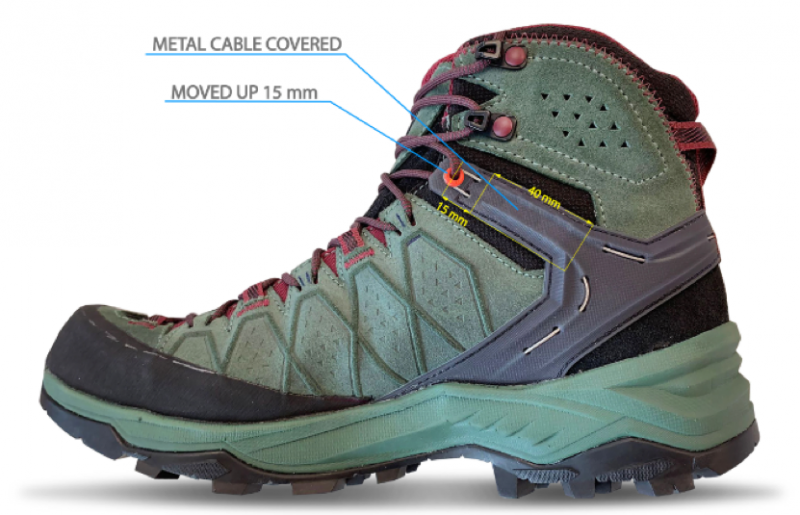 Die Herbst-22-AT2-Stiefel können anhand der Stiefelseite von den zurückgerufenen AT2-Stiefeln unterschieden werden: Die Herbst-22-AT2-Stiefel haben ein verdecktes Stahlseil und einen anderen Schnürpunkt (15 mm oder 1,5 cm näher an der Zunge) als die zurückgerufenen AT2-Stiefel.