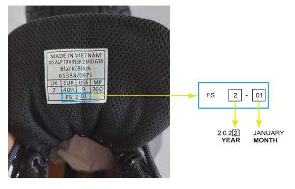 Zurückgerufene AT2-Stiefel können anhand des Produktionsdatums auf der Innenseite des Zungenetiketts am Stiefel identifiziert werden. Das Produktionsdatum auf dem Etikett beginnt mit „FS“. Aus den Zahlen auf dem Etikett gehen wie folgt Jahr und Monat der Produktion hervor: Die erste Zahl ist die letzte Ziffer des Produktionsjahres und die zweite Zahl bezeichnet den Monat der Produktion. Zum Beispiel steht FS 2-01 für ein Produktionsdatum im Januar 2022.