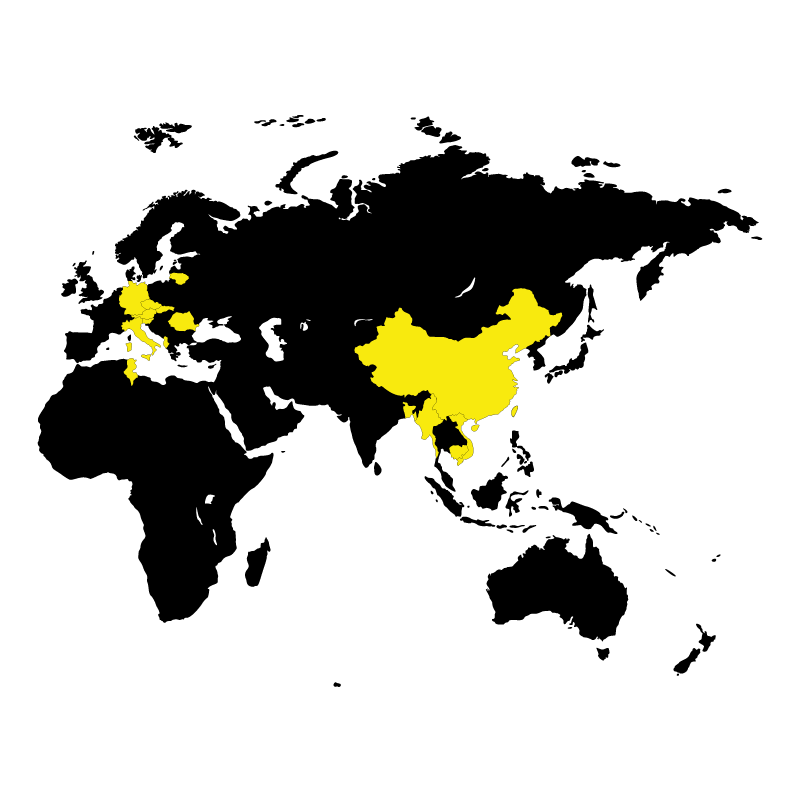Asia: Bangladesh, Cambodia, China, India, Korea, Myanmar, Taiwan, Vietnam