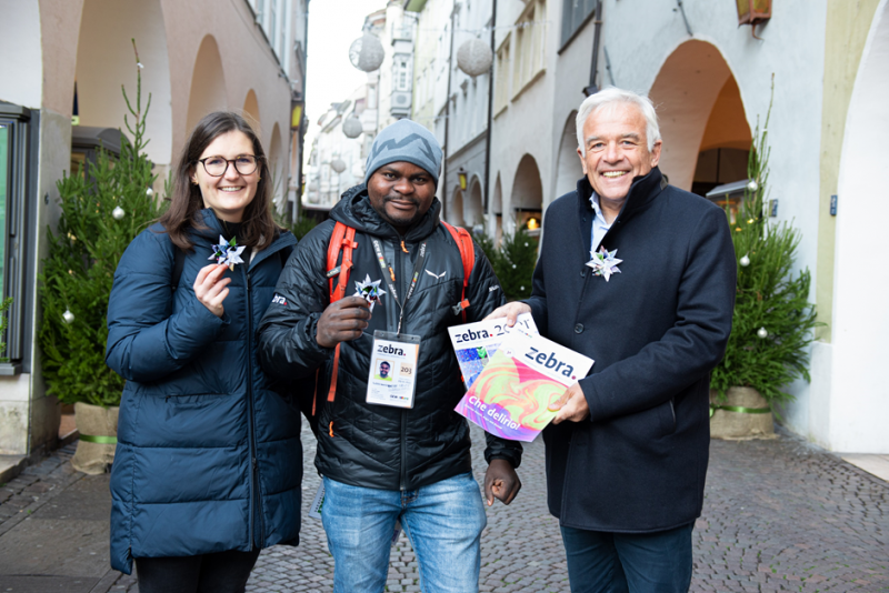 The OEW (Organization for a Solidary World), based in Brixen/South Tyrol, publishes a monthly street newspaper called "Zebra." The social project enables 60 people in precarious life situations to engage in dignified work until they manage to enter the job market. The vendors of the street newspaper are currently mainly migrants from Africa. The vendors were equipped with Salewa jackets three years ago, which they have been wearing almost every day. This year, Oberalp arranged that the jackets were repaired and donated some new jackets.