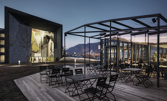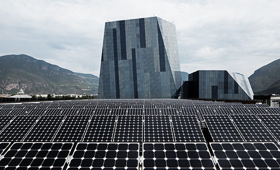 This comprehensive approach can be seen in many areas. The building was constructed using natural materials; wood, loden, glass, steel and cement. As well as this obvious commitment to nature, it was just as important for us that 90 percent of the companies involved in the construction should come from the region. Behind the building facade hides a so-called concrete core activation: Thermal energy can be stored and exchanged thanks to a pipe system within our headquarters' buildings. This heating and cooling system makes radiators almost redundant. The building is also insulated by a green roof, the Living Green Roof. At our headquarters alone the photovoltaic system produces 705,535 kilowatt hours. Together with our two other installations in Bolzano, we produce more energy than we need ourselves.