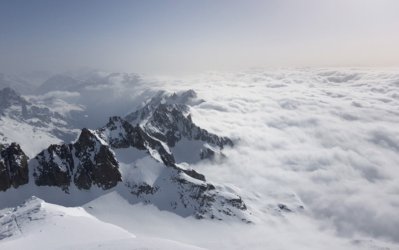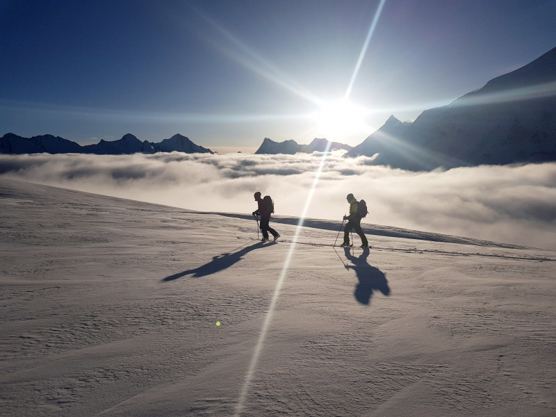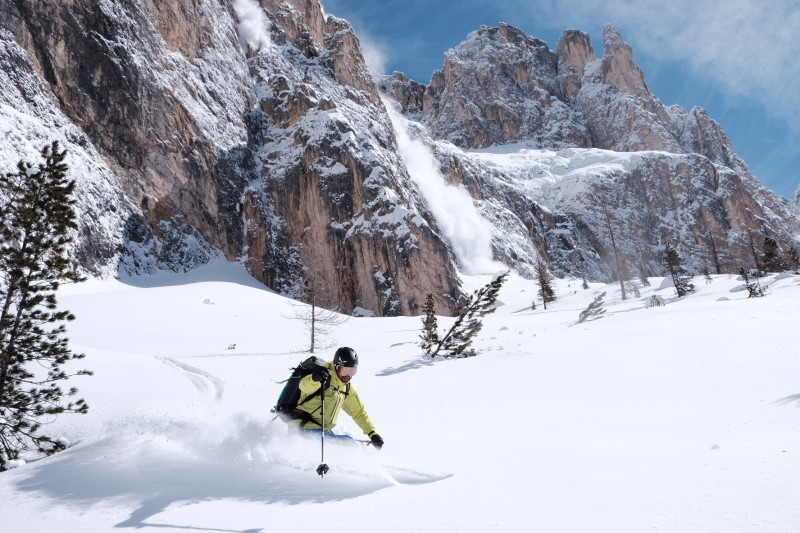 Los dos parten el quince de marzo, rumbo al norte, hacia la Marmolada y, a continuación, en dirección a Pordoi y el valle de Gardena. Son cuatro días intensos y preciosos, contemplando la belleza de los Dolomitas desde cualquier ángulo, desde cualquier perspectiva. Le siguen Austria, los Alpes de Stubai y el glaciar homónimo, imponente y agraciado, y de ahí rumbo al oeste, a los Grisones. En este punto Nikola empieza a tener algún problema en la espalda: él se mueve en splitboard, que no es el medio más idóneo para largas travesías a afrontar con una mochila pesada. Mejor parar. Arnaud continúa solo.