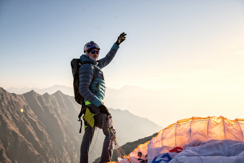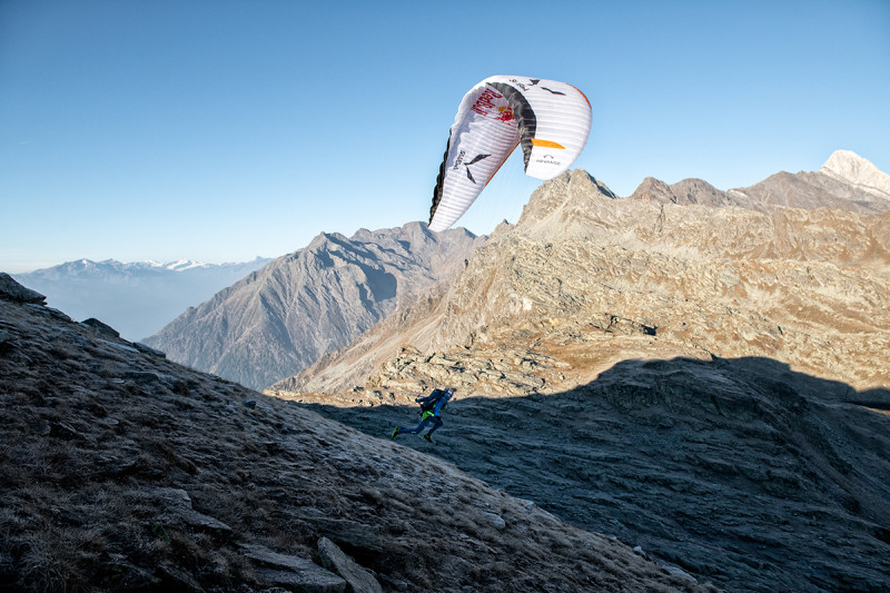 Aaron saca una pequeña mochila de su furgoneta, cuidadosamente preparada la noche anterior. Se la echa a la espalda, y llega el momento de partir. Los primeros pasos son lentos, largos, para avisar a los músculos de que el tercio ha cambiado. El ritmo aumenta gradualmente, junto con el ritmo de su respiración y sus pulsaciones. Las sendas que suben a lo alto, detrás de Lagundo, están a la sombra, pero el cielo aún no ha empezado a teñirse de los oscuros colores purpúreos de la noche: la luz aún es ámbar, aún queda tiempo. Aaron aumenta el ritmo; los prados de Muta quedan ahora detrás de él. Hay suficiente luz, si te das prisa. Puedes subir a la cima, a despegar arriba del todo, en la cumbre del Mutspitze.