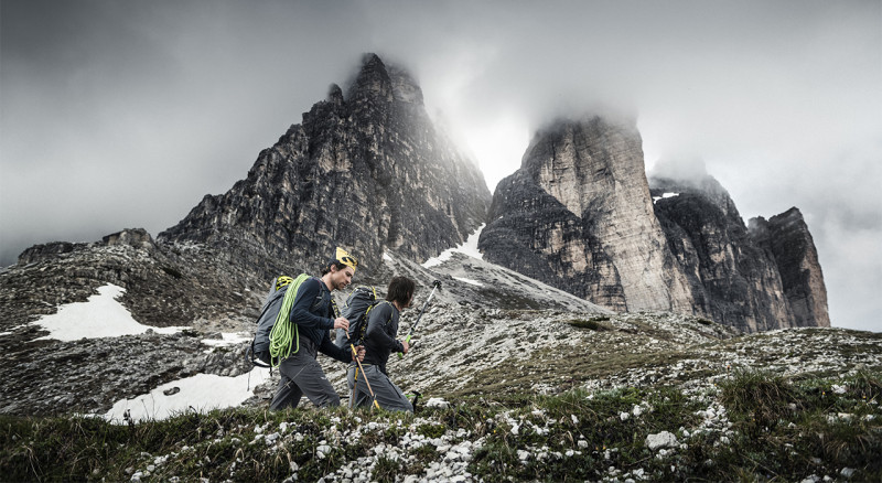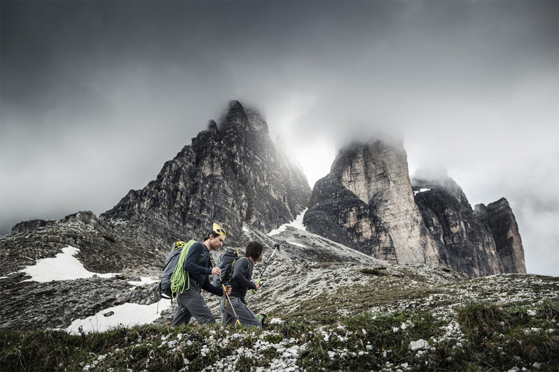 Los Tre Cime no son montañas. Su figura elegante, solitaria e imponente es sobre todo un símbolo, y solo tocar su roca despierta un sinfín de emociones. Simon y Vitto dejan las bicis y se dirigen al inicio de la Comici-Dimai en Cima Grande. Todo parece ir bien, pero ha comenzado otra vez a llover. La ruta está anegada. Por las mangas de los escaladores lo que se cuelan no son gotas, sino auténticos ríos de agua helada. La situación es desesperante pero hacen falta tres largos para que alguien se atreva a abrir la boca. Al final es Vitto quien pregunta: «¿De verdad quieres subir, Simon?». La lluvia le responde aumentando su intensidad.