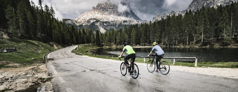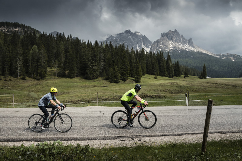 Los tonos rosáceos del amanecer les dan la bienvenida a Castelbello, en el Valle Venosta, y antes de las ocho están ya en Bolzano, con el tiempo justo para tomarse un cruasán y un par de cafés antes de volver a subirse a los sillines en dirección al Valle Pusteria. El camino ahora es cuesta arriba y el sol pega fuerte, por lo que el paseo es de todo menos relajante. Cuando llegan a Dobbiaco, el cielo está cubierto de nuevo, y Simon y Vitto pueden descansar del calor. Cae una gota, después otra y empieza a llover a mares. Es algo frecuente en los Dolomitas; chubascos que no solo te dejan hecho una sopa, sino que caen con tanta fuerza que parece que te están echando cubos de agua encima. Los dos compañeros continúan pedaleando, estoicos pese al cansancio.