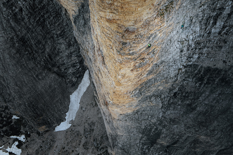 Simon y Vitto se miran. Abandonar nunca es fácil, especialmente después de un esfuerzo tan grande, tras meses de entrenamiento, y no precisamente por el qué dirán. Dejarlo es difícil porque dice algo sobre ti y puede que sea algo que no quieres oír. Pero el buen alpinista es el que llega a viejo, así que haciendo rapel los dos alcanzan la base. Mientras se abren paso entre los sedimentos con un peso más grande en su conciencia que en sus piernas, la montaña les ofrece una solución: la ruta Spigolo Giallo, otra de las rutas de Emilio Comici en Cima Piccola. Despunta entre una densa nube y parece tener unas mejores condiciones.