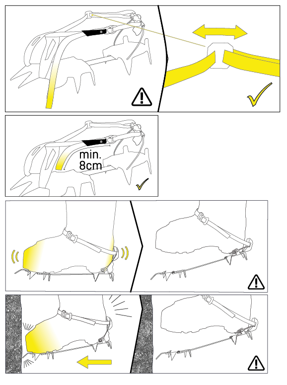 Always check the positioning of the straps before each use. Also be sure to check the fit by standing on the crampons and turning your foot, leaning into it on the front and back and putting your weight down on the crampons several times.